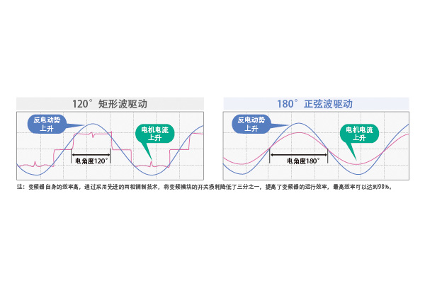 應(yīng)用180°矢量控制技術(shù),有效抑制壓縮機(jī)吸排氣時(shí)的振動(dòng)。實(shí)現(xiàn)壓縮機(jī)平穩(wěn)運(yùn)轉(zhuǎn),進(jìn)一步降低室外機(jī)運(yùn)行噪音。